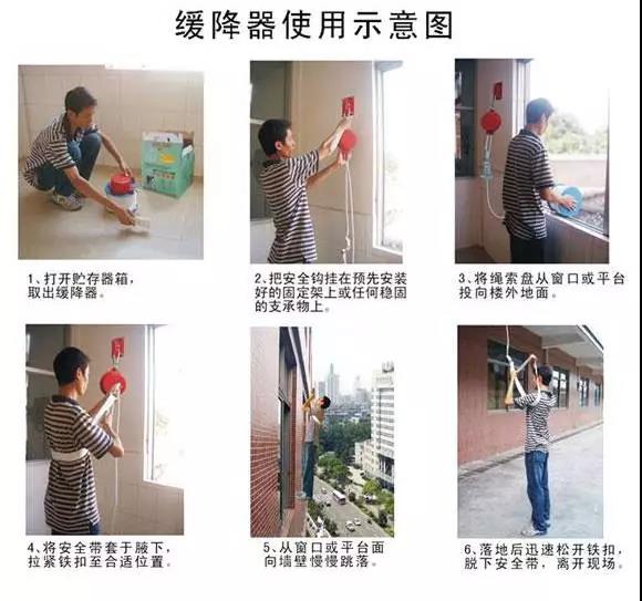 ④ 緩降器可以重復(fù)使用,一個(gè)人下降到地面上后,樓上的人可以用卷盤把繩索卷回去,繼續(xù)使用。建議緩降器單人使用,更加安全一點(diǎn)。