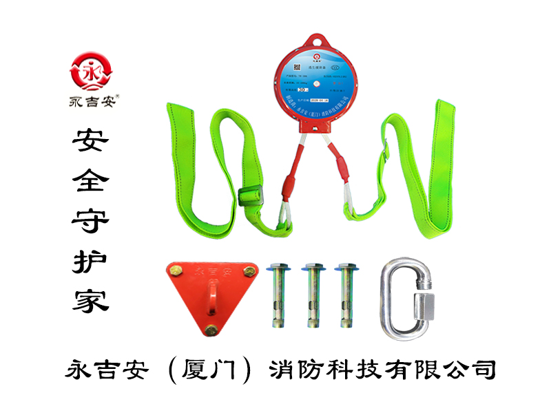 逃生緩降器由調(diào)速器、安全鉤、鋼絲繩、安全帶、掛架組成。